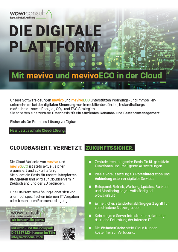mevivo und mevivoECO unterstützen bei der digitalen Steuerung von Immobilienbeständen, Instandhaltungsmaßnahmen sowie Energie-, CO₂- und ESG-Strategien. Ziel ist eine zentrale, verlässliche Datenbasis für ein effizientes Gebäude- und Bestandsmanagement.